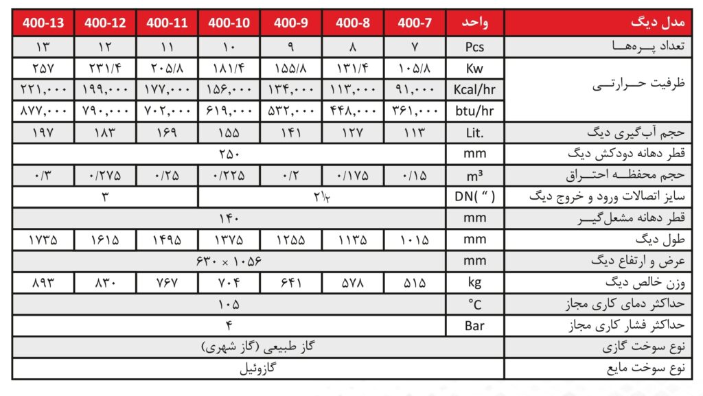ظرفیت حجم آب موجود در دیگ از ۱۱۳ لیتر تا ۱۹۷ لیتر